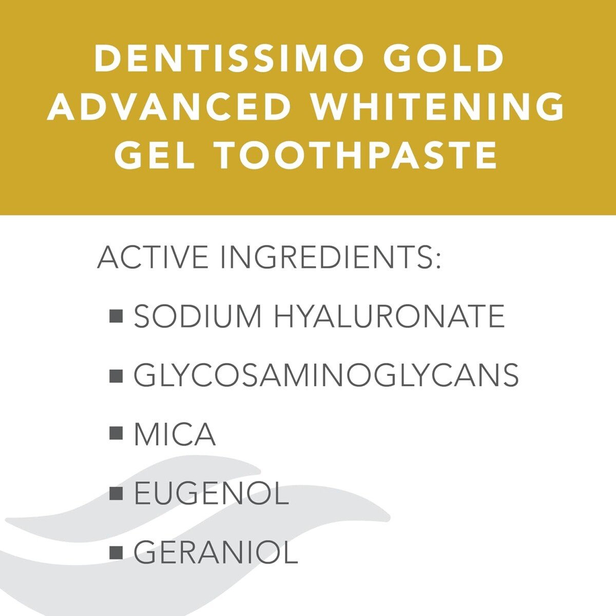 Dentissimo Gold Whitening Toothpaste combines cutting-edge whitening technology with premium ingredients to gently and effectively restore the natural whiteness of your teeth. Perfect for those who value both oral hygiene and a brilliant, radiant smile.